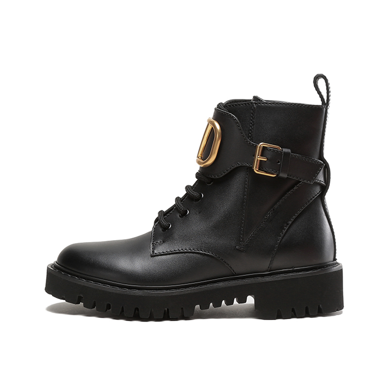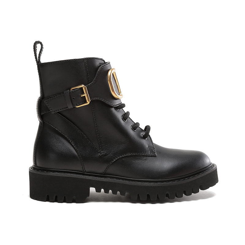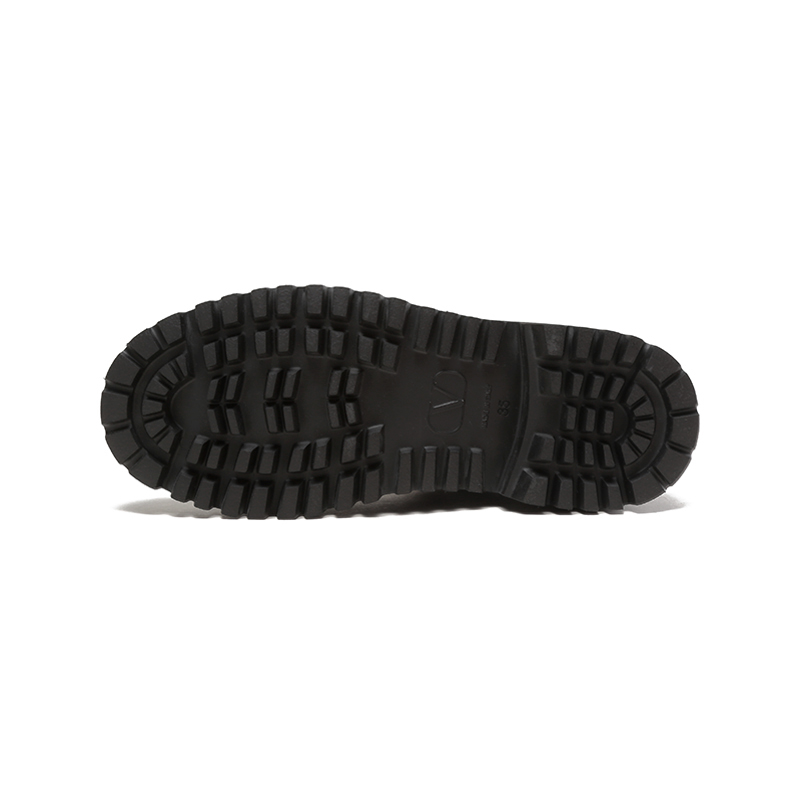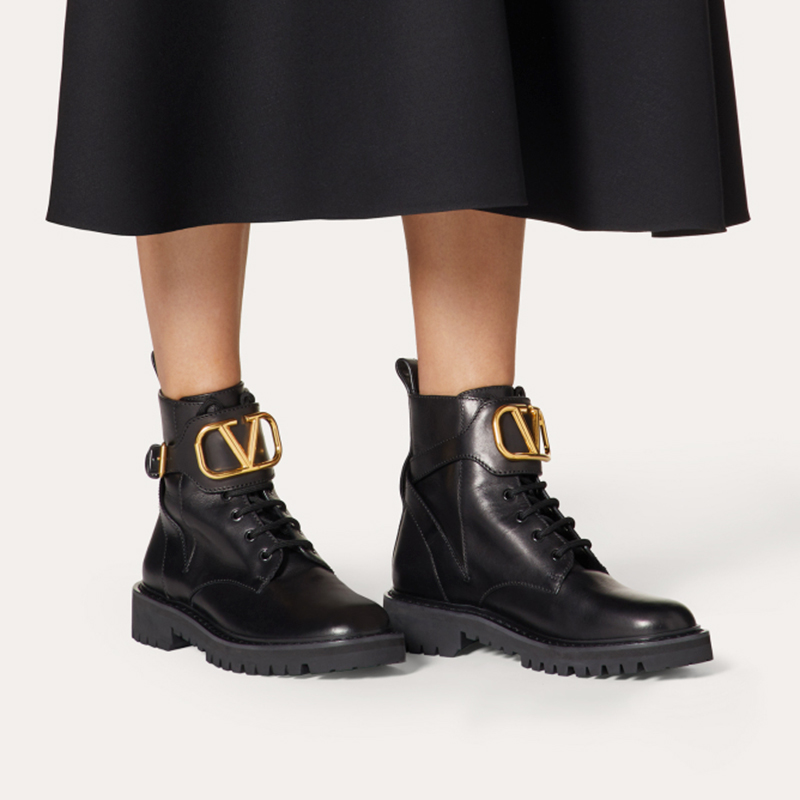 - Valentino Garavani小牛皮军旅风短靴,装饰VLogo Signature细节,复古黄铜工艺效果处理VLogo Signature细节,橡胶凹凸纹鞋底。